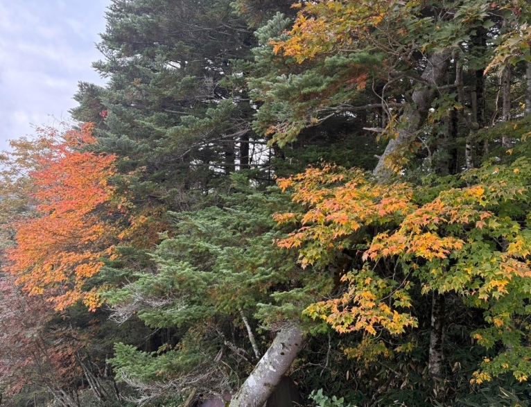 山の木々が少しずつ色づきはじめ、赤や黄色の葉が風に揺れています。