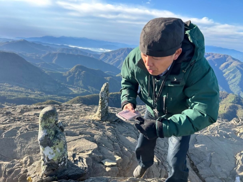 足元が悪く上まで行けないお客様に石仏の写真を撮るげじぽん。